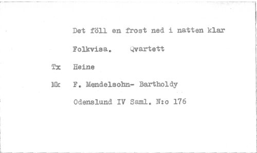 //// Det föll en frost ned i natten klar //// Folkvisa. Qvartett //// Tx Heine //// ?Åk F. Mendelsohn- Bartholdy Odensltuid IV Saml. N:o 176 ////
