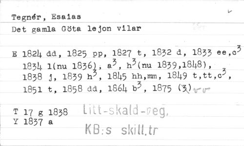 //// Tegnér, Esaias //// Det gamla Göta lejon vilar //// E 1824 dd, 1825 pp, 1827 t, 1832 d, 1833 ee,c3 //// 1834 1(nu 1836.1, a3, h3(nu 1839,1848), 2 //// 1838 j, 1839 h2, 1845 hh,n, 1849 t,tt,c--1, //// 1851 t, 1858 dd, 1864 b3, 1875 () //// T 17 g 1838 Y 1837 a ////