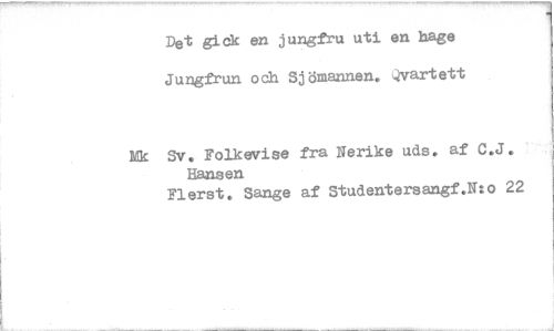 //// Det gick en jungfru uti en hage Jungfrun och Sjömannen. 4vartett //// Mk Sv. Folkevise fra Nerike uds. af C.J. Hansen //// Flerst. Sange af Studentersangf.N:o 22 ////