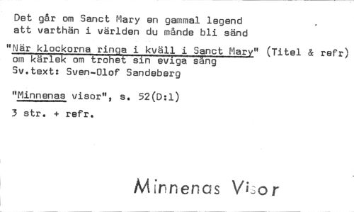//// Det går om Sanct Mary en gammal legend att varthän i världen du månde bli sänd //// "När klockorna ringa i kväll i Sanct Mary" (Titel & refr) om kärlek om trohet sin eviga sång Sv.text: Sven-Olof Sandeberg //// "Minnenas visor", s. 52(D:1) 3 str. + refr. //// Minnenas Visor ////