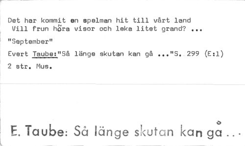 //// Det har kommit en spelman hit till vårt land Vill frun nära visor och leka litet grand? ... //// "September" //// Evert Taube:"Så länge skutan kan gå ..."S. 299 (E:1) 2 str. Mus. //// 0 //// E. Taube: Så länge skutvin kan ga ////