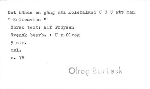 //// Det hände en gång uti Koleraland U U U att man //// " Kolreavisa " //// Norsk text: Alf Pröysen //// Svensk bearb. : U p Olrog //// 5 str. //// inel. //// s. 7S //// aroc 51 F 7 r Le sK ////