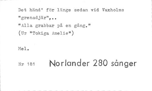 //// Det händ' för länge sedan vid Vaxholms "grenadjär",.. //// "Alla grabbar på en gång." //// (Ur "Tokiga Amelie") //// Nr 181 Norlander 280 sånger ////