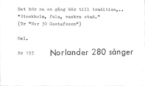 //// Det hör nu en gång här till tradition". "Stockholm, fula, vackra stad." (Ur "N:r 30 Gustafsson") //// Mel. //// Nr 193 Norlander 280 sånger ////