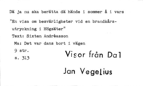 //// Dä ja nu ska berätta dä hände i sommer å i vars //// "En visa om besvärligheter vid en brandkårsutryckning i Högsäter" //// Text: Sixten Andråasson //// Ma: Det var dans bort i vägen //// 9 str. s. 313 //// Jan Vegelius //// Visor från Dal ////