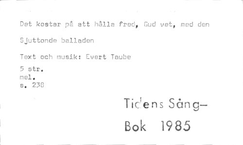 //// Det kostar på att hålla fred, Gud vet, med den Sjuttonde balladen //// Text och musik: Evert Taube //// 5 str. mel. //// s. 238 //// Ticiens Sång— //// Bok 1985 ////