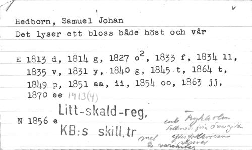 //// iiedborn, Samuel Johan //// Det lyser ett bloss både höst och vår //// E 1813 d, 1814 g, 1827 02, 1833 f, 1834 11, 1835 v, 1831 y,,1840 g, 1845 t, 186)4 t, //// 1849 p, 1851 aa, ii, 18514 00, 1863 ii, 1870 ee //// 1dt-skald-i-eg, //// N 1856 e //// KB:s //// tb, //// 4.4 4 re~« //// ;t a(3411(944' //// letwIrsche~^~~ ////