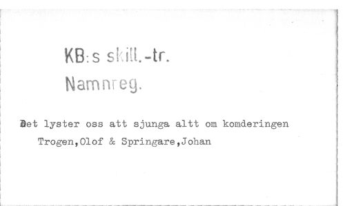 //// KB:s ski[E.-tr. //// Namnreg. //// Det lyster oss att sjunga altt om komderingen Trogen,Olof & Springare,Johan ////