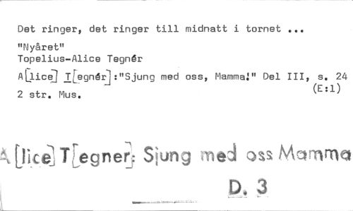 //// Det ringer, det ringer till midnatt i tornet ... //// "Nyåret" //// Topelius-Alice Tegnér //// Allice] TLegnår.]:"Sjung med oss, Mamma:" Del III, s. 24 //// (E:1) //// 2 str. Mus. //// Sjung mei oaR tvinrnrne) //// 0.3 ////