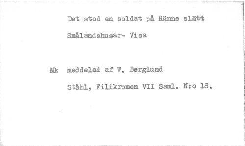//// Det stod en soldat på Ränne slätt Smålandshusar- Visa //// Nk meddelad af W. Berglund //// Ståtel, Filikromen VII Saml. Nto 18. ////