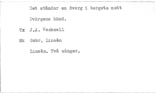 //// Det ståndar en dverg i bergets natt //// Dvärgens hämd. //// Tx J.J. Weeksell //// fik Gabr, Linsån //// Lins6n. Två sånger. ////