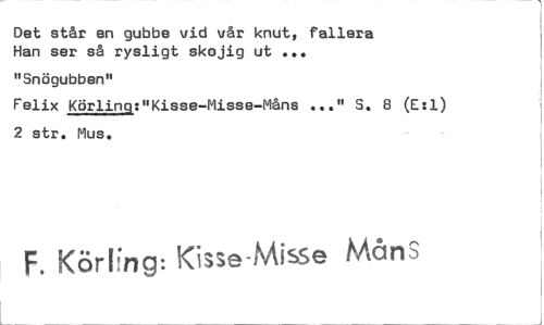 //// Det står en gubbe vid vår knut, fallera Han ser så rysligt skojig ut ... //// "Snögubben" //// Felix Körlinq:"Kisse-Misse-Måns ..." S. 8 (E:1) 2 str. Mus. //// F. KörEng: Kisse-Misse Måns ////