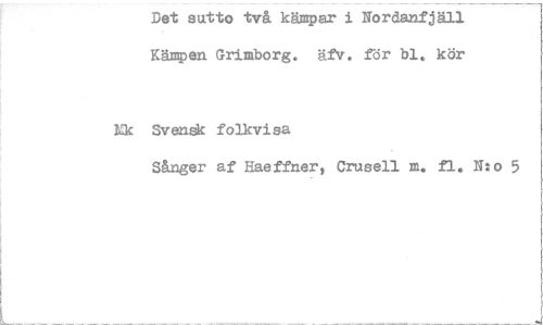 //// Det sutto två kämpar i Noraanfjäll //// Käppen Grimborg. äfv. för bl, kör //// lak Svensk folkvisa //// Sånger af Haeffner, Crusell m. fl. N:0 5 ////