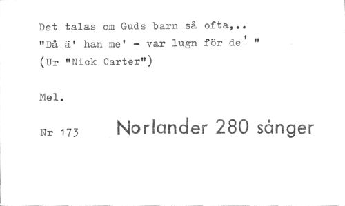 //// Det talas om Guds barn så ofta,.. "Då ä' han me' — var lugn för de' " (Ur "Nick Carter") //// Mel. //// Nr 173 Norlander 280 sånger ////