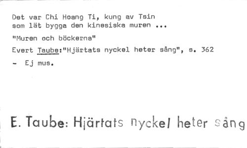 //// Det var Chi Hoang Ti, kung av Tsin som lät bygga den kinesiska muren ... //// "Muren och böckerna" //// Evert Taube:"Hjärtats nyckel heter sång", s. 362 //// - Ej mus. //// E. Taube: Hjärtats nyckel heter =.ång ////