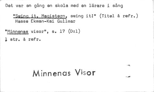 //// Det var en gång en skola med en lärare i sång //// "Swing it, Magistern, swing it!" (Titel & refr.) Hasse Ekman-Kai Gullmar //// "Minnenas visor", s. 17 (D:1) str. & refr. //// Minnenas Visor ////