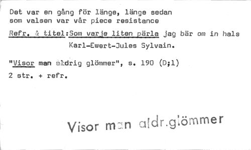 //// Det var en gång för länge, länge sedan som valsen var vår piece resistance //// Refr. ;1 titel:Som varje liten pärla jag bär om in hals //// Karl-Ewert-Jules Sylvain. //// "Visor man akdrig glömmer", s. 190 (D;1) 2 str. + refr. //// Visor mIn akir.g:örnmer ////