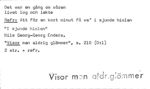 //// Det var en gång om våren livet log och lekte //// Refr: Att för en kort minut få va' i sjunde himlen //// "1 sjunde himlen" //// Nils Georg—Georg Enders. //// "Visor man aldrig glömmer", s. 210 (D:1) //// 2 str. refr. //// Visor m7n rildr.g:örnmer ////