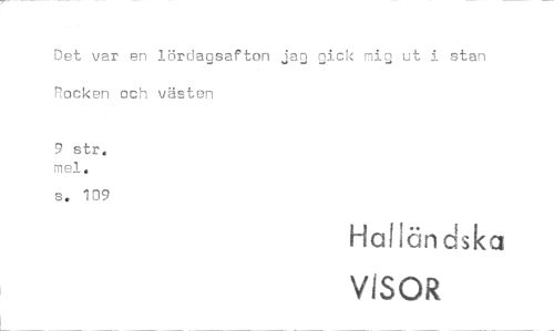 //// Det var en lördagsafton jag gick nig ut i stan flocken och västen //// 9 str. //// mel. //// s. 109 //// Halländska //// VISOR ////