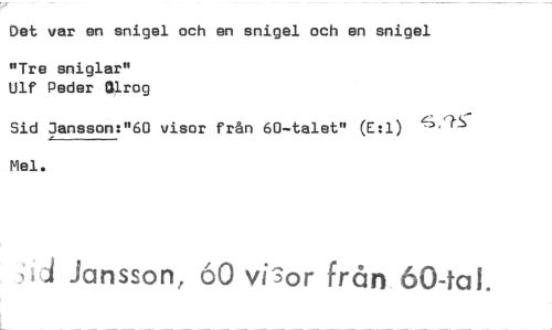 //// Det var en snigel och en snigel och en snigel //// "Tre sniglar" Ulf Peder alrog //// Sid Jansson:Ha) visor från 60-talet" (E:1) //// Mel. //// Jansson, 60 vi Sorfrån 60-tal. ////