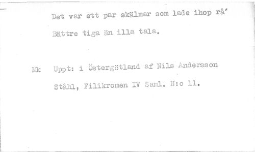 //// Det var ett par skälmar som lade ihop rå' Bättre tiga än illa tala. //// Lk Uppt: i Östergötland af Nils ,,ndertson //// Filikromen :V Sara. N:o ////