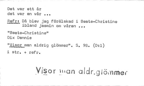 //// Det var ett år //// det var en vår ... //// Refr: Då blev jag förälskad i Beate-Christine ibland jasmin om våren ... //// "Beate-Christine" Dix Dennie //// "Visor man aldrig glömmer". S. 98. (D:1) i str. + refr. //// Visor litan aldr.giö.-nmec ////