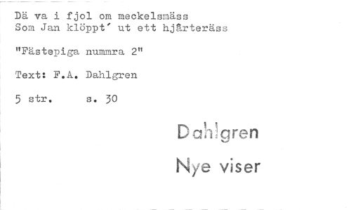 //// Dä va i fjol om meckelsmäss //// Som Jan klöppt' ut ett hjårteräss //// "Fästepiga nummra 2" Text: F.A. Dahlgren //// 5 str, s. 30 //// D all a ren //// N- viset- ////