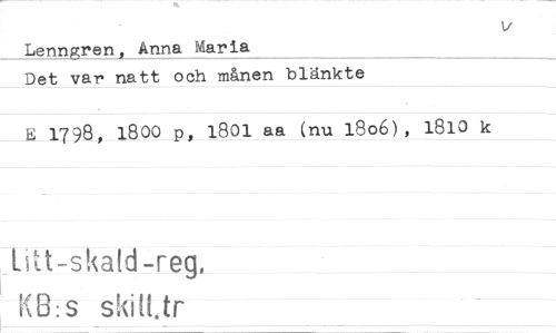 //// Lenngren, Anna Maria //// Det var natt och månen blänkte //// E 1798, 1800 p, 1801 aa (nu 18o6), 1810 k //// titt-skatcl-reg, //// KB:s skitt tr ////