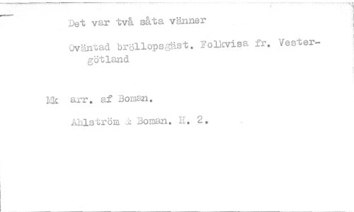 //// Det var två aåta vänner //// Oväntad bröllopsgäst. Folkvisa fr. Vestergötland //// Ek arr. af Boman. //// ALlström å. Boman. H. 2. ////