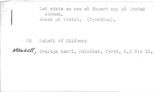 //// Det växte en ros så fagert opp på Trotsö strand. //// Rosen på Wresö. (Fyrstänn). //// 11,c Lelodi af Blidberg //// friaide-e,« Lverigs herrl. nelodier. Fyrst. H.3 140 18. ////
