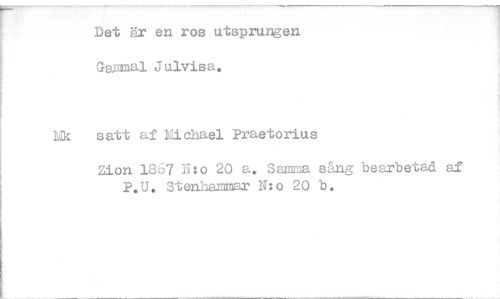 //// Det är en ros utsprungen Gammal Julvisa. //// DI satt af Lichael Praetorius //// non 1867 N:o 20 a. Samma sång bearbetad af P.U. Stenhammar N:o 20 b. ////