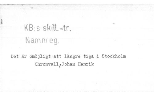 //// KB:s skilt.-tr, //// Namnreg. //// Det är omöjligt att längre tiga i Stockholm Chronvall Johan Henrik ////