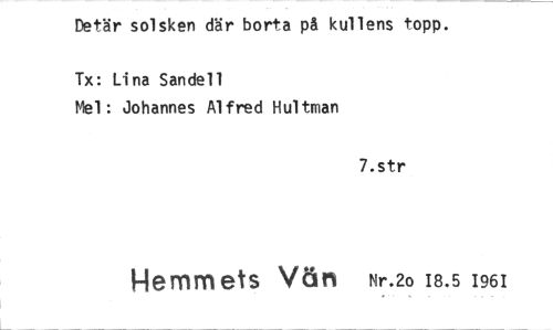 //// Detär solsken där borta p& kullens topp. //// Tx: Lina Sandell //// Mel: Johannes Alfred Hultman //// 7.str //// Hemmets Vän Nr.2o 18.5 1961 ////