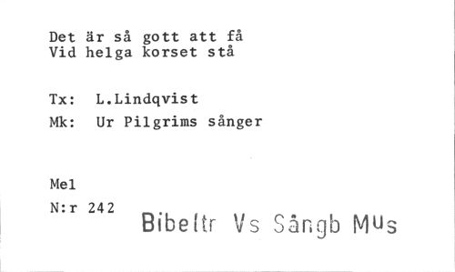 //// Det är så gott att få Vid helga korset stå //// Tx: L.Lindqvist //// Mk: Ur Pilgrims sånger //// Mel //// N:r 242 Bibeltr Vs Sångb Mus ////