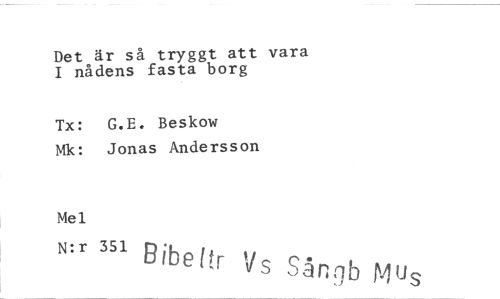 //// Det är så tryggt att vara I nådens fasta borg //// Tx: G.E. Beskow //// Mk: Jonas Andersson //// Mel //// N:r 351 Ribe ikr Vs Sångb P4us ////