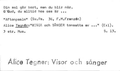 //// Din sol går bort, men du blir när. D'Glid, du alltid hos oss är ... //// "Aftonpsalm" (5v.Ps. 36, F.M.Franzdn) //// Alice Teondr:HVISOR och SÅNGER tonsatta av ...H (E:1). //// 3 str. Mus. S. 13. //// Alice "regnen Visor och sånger ////