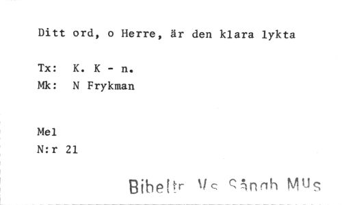 //// Ditt ord, o Herre, är den klara lykta //// Tx: K. K - n. Mk: N Frykman //// Mel //// N:r 21 //// ihettr ils C~rtnh MUS ////