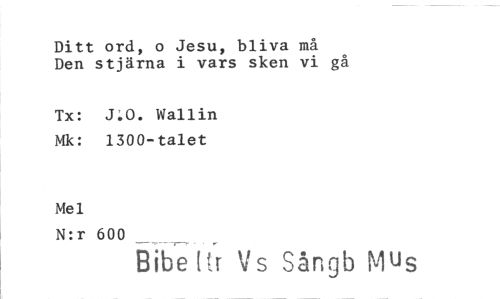 //// Ditt ord, o Jesu, bliva må Den stjärna i vars sken vi gå //// Tx: J.O. Wallin Mk: 1300-talet //// Mel //// N:r 600 //// r--- //// Bibe I gir Vs Sångb Mus ////