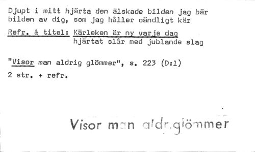 //// Djupt i mitt hjärta den älskade bilden jag bär bilden av dig, som jag håller oändligt kär //// Refr. & titel: Kärleken är ny varje dag hjärtat slår med jublande slag //// "Visor man aldrig glömmer", s. 223 (D:1) //// 2 str. refr. //// Visor rn- n -if jämmer ////