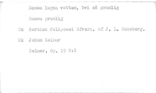 //// Donau lugna vatten, Lvi så grumlig //// Donau grumlig //// 2x Serbisk Folkpoesi öfvers. af J, L. Runeberg. //// Ek Johan Selmer //// Selmer, Op. 15 N:2 ////