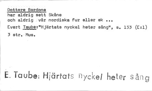 //// Dottore Bordone //// har aldrig sett Skåne //// och aldrig vår nordiska fur eller ek ... //// Evert Taube:"Hjärtats nyckel heter sång", s. 153 (E:1) 3 str.-Mus. //// E. Taube: Hjärtats nyckel heter sång ////