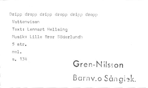 //// dripp dropp dripp dropp dripp dropp //// Vattenvisan //// Text: Lennart Hellsing //// Musik: Lille Bror Söderlundh //// 5 str. //// mel. //// s. 134 //// Gren-Nilsson E3Grnv.o 5CI,10:'11( ////
