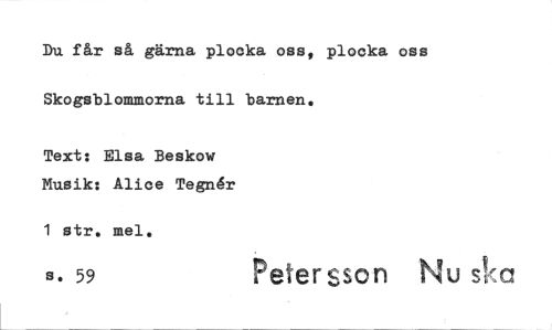 //// Du får så gärna plocka oss, plocka oss Skogsblommorna till barnen. //// Text: Elsa Beskow Musik: Alice Tegn4r //// 1 str, mel, //// 8. 59 Petersson Nu srxt ////