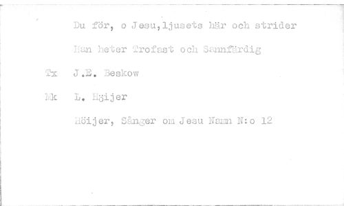 //// Du för, o Jesu,ljusets här och strider //// Han heter trofast och Sannfärdig //// Tx J.B. Beskow //// L. höijer //// liöijer, Sänger om Jesu Namn N:o 12 ////