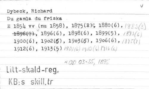 //// Dybeck, Richard //// Du gamla du friska //// E 18514 vv (nu 1858), 1875(2)e, 1880(6)9 122.5,64 boy6t---7+, 1896(6), 1898(6), 1899(5), ("k) 1900(6), 1 9 02(6) 19o3 (6) 1 9°6( 6 ) lt1,1-01 1912(6) , 1913(5) /9,044) 44041,6 4-4- //// -Kot)03-3.5, 12595" //// Litt-skald-reg, //// KB:s syöl ,tr //// //// //// ////
