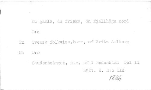 //// 1.)u gamla, du friaka, du f3dl1höga nord D:o //// Lx Svensk folkvisa,harm. af rittrlberg Lk D:o //// • Studentsången, utg. af I .edenblad Jel II Ltt. 2. 11:o 112 //// /gg ////