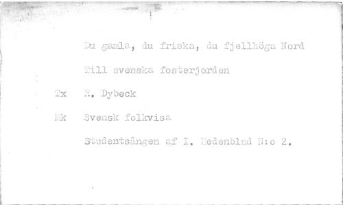 //// Du gamla, du friska, du fjellhöga Nord. //// All svenska fosterjorden //// 2x R. Dybeck //// hk Svensk folkvisa //// Studentsången af 1. IJedenblad N:o 2. ////