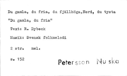 //// Du gamla, du friat du fjällhögajord, du tysta "Du gamla, du fria" //// Text: R. Dybeck //// Musik: Svensk folkmelodi //// 2 str. mei. //// 54 152 Peters on l'4u sko ////