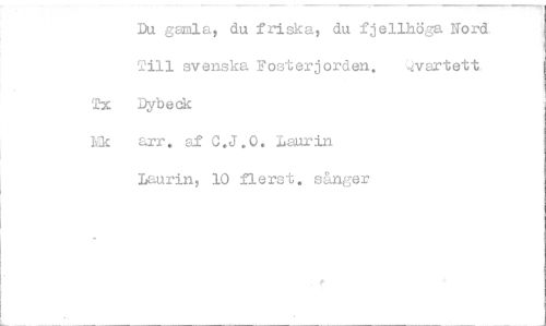 //// Du gamla, du friska, du fjellhöga Nord. //// Till svenska Fosterjorden. ',„vartett.. //// Tx Dybeck //// Ek arr. af 0.J.0. Laurin //// Laurin, 10 flerst. sånger ////