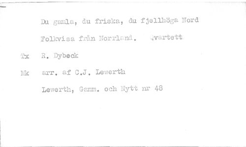 //// Du gamla, du friska, du fjelihöga Nord //// Folkvisa från Norrland. ,:yartett. //// 2x R. Dybeck //// Ik arr. af C.J. Lewerth //// Lewerth, Gam. och Nytt. nr 48 ////